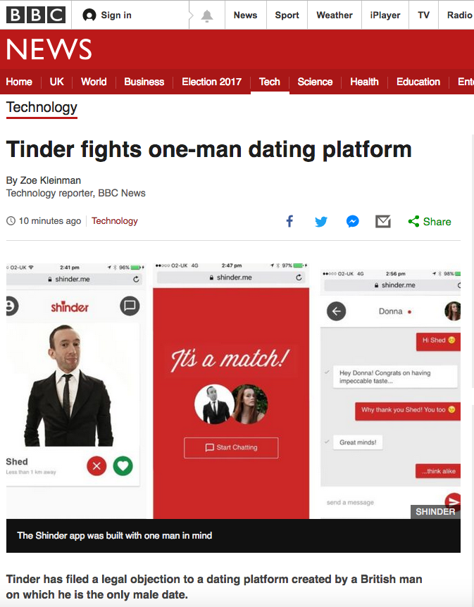 The fantastic BBC journalist Zoe Kleinman covered the story of Tinder (and Schindler) taking action against Shinder, my one man dating app. To read the full story, the link is here or click on the image below. You can view legal documents relating to the action below...